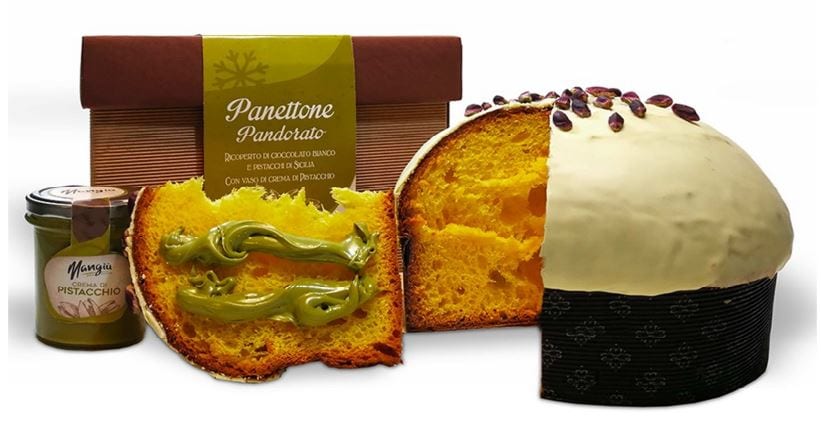 Farina di grano tenero tipo 00, burro, zucchero, tuorlo d’uovo fresco, lievito naturale. Emulsionanti: mono e digliceridi degli acidi grassi, aromi naturali, sciroppo di glucosio, latte scremato in polvere, miele, sale. Copertura: cioccolato bianco 8% (zucchero, burro di cacao, latte in polvere, siero di latte in polvere, emulsionante: lecitina di soia, estratto di vaniglia), pistacchi siciliani 5%.